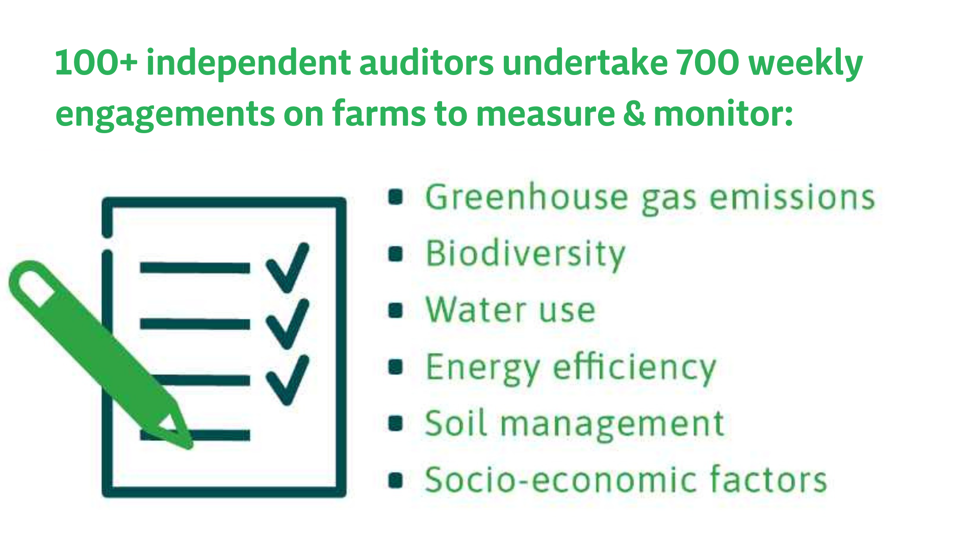 Throughout the country, over 100 independent auditors, working on behalf of Bord Bia, undertake 700 weekly engagements on farm as part of these programmes. In addition to quality, the sustainability criteria measured and monitored are greenhouse gas emissions, biodiversity, water use, energy efficiency, soil management and socio-economic factors. Origin Green offers practical guidance and advice to inform farmers on how to become more sustainable, primarily through the Farmer Feedback Report implemented in 2019.