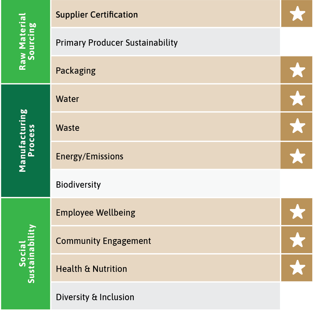 Supplier Certification, Packaging, Water, Waste, Energy/ Emissions, Employee Wellbeing, Community Engagement and Health & Nutrition.